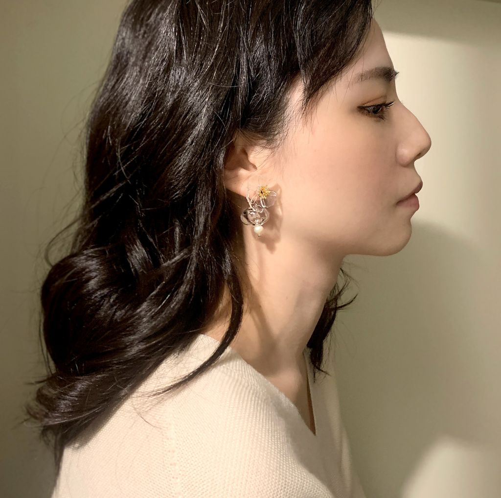 罌粟花耳環與玻璃墜飾、珍珠做搭配,簡單俐落又特別。
