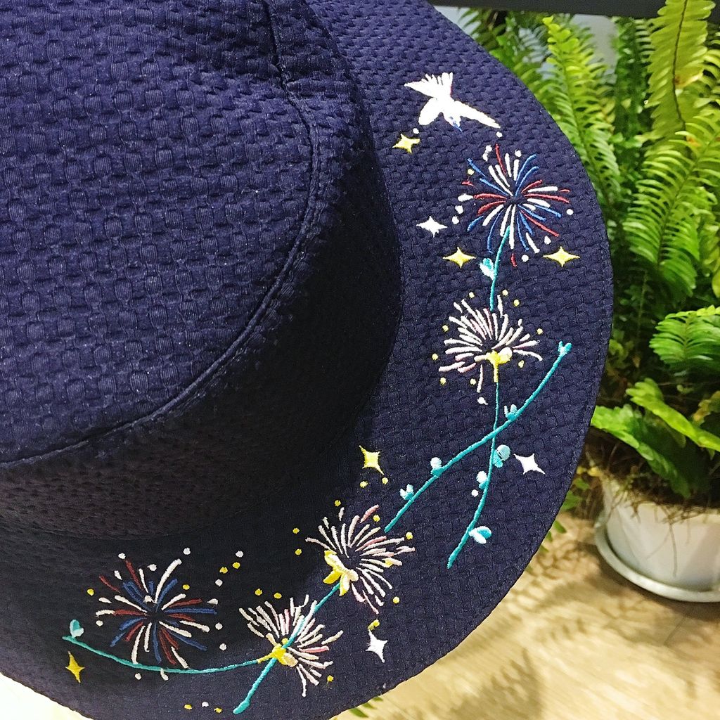 雙面|淑女帽| 深藍緹花布 |刺繡 ( 夜花火)